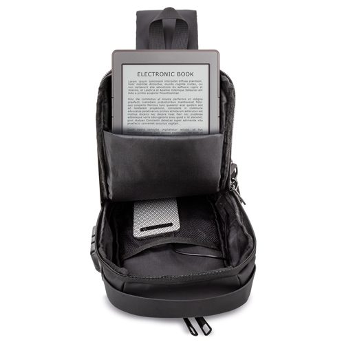 Completa bandolera resistente a las salpicaduras, cierre de seguridad, conexión USB para power bankInterior acolchado con bolsillos y tirantes acolchados para tablets de 8″Bolsillo trasero antirrobo y bolsillo en tiranteBanda reflectante.