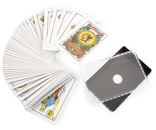 Contiene 50 Cartas, incluídos los comodines.Medida Cartas: 9,4 x 6,2 cm