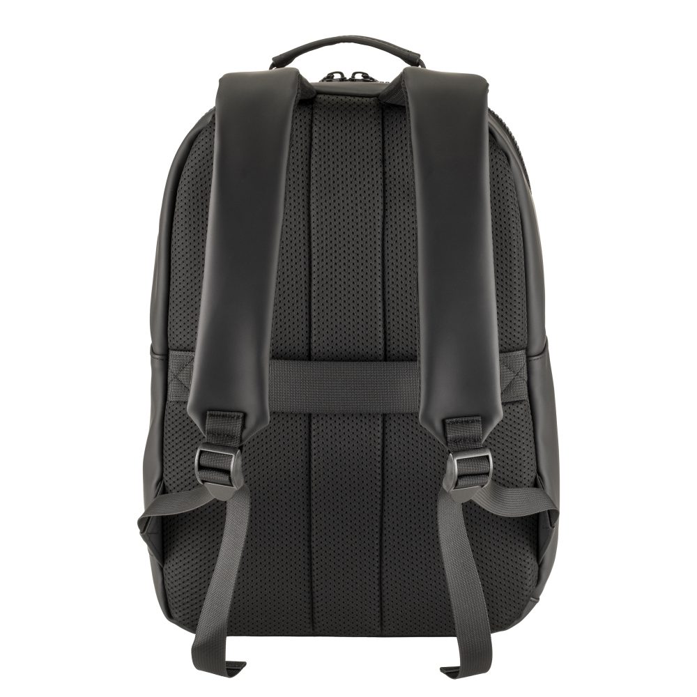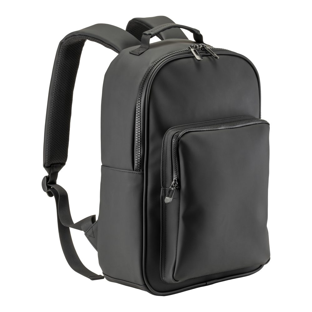 Mochila para ordenador portátil (15) en PU suave resistente al agua reforzada con un revestimiento interior de poliéster. Compartimento acolchado para ordenador portátil. Amplio bolsillo frontal. Espalda y correas acolchadas con material transpirable. Sistema de enganche para trolley.