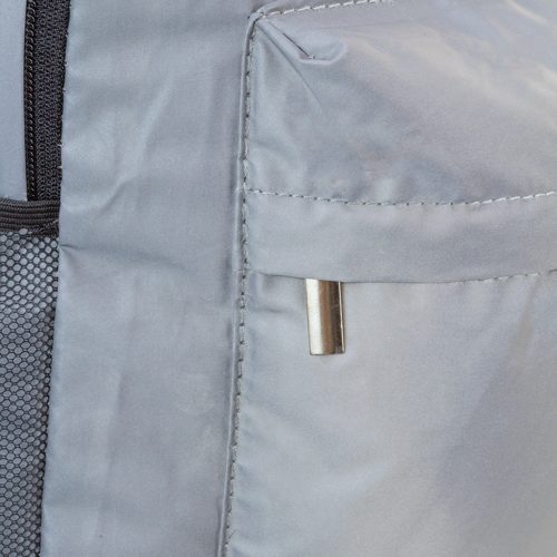 Mochila reflectante realizada en material poliéster RpetIncluye bolsillo frontal con cremallera y un bolsillo lateral con malla.