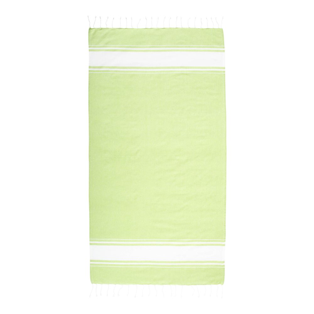 Toalla de playa de algodón reciclado de 150 g/m2 con efecto mélange, dos bandas laterales y flecos. Cuenta con la certificación GRS (Global Recycled Standard)